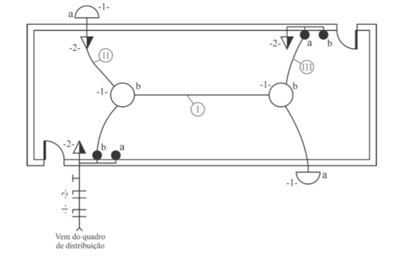 A figura abaixo representa um trecho de uma planta baixa no qual poderá ser visto o diagrama unifilar da instalação elétrica obedecendo a disposição dos interruptores, pontos de luz e eletrodutos já alocados.