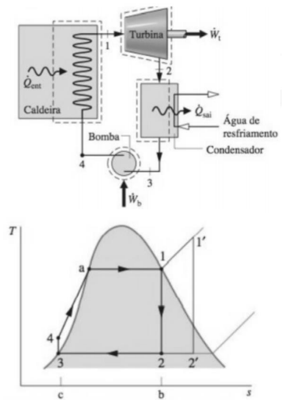 A figura a seguir ilustra o ciclo de Rankine ideal, no qual o fluido de trabalho passa através dos componentes do ciclo sem irreversibilidades e trocas de calor com a vizinhança.