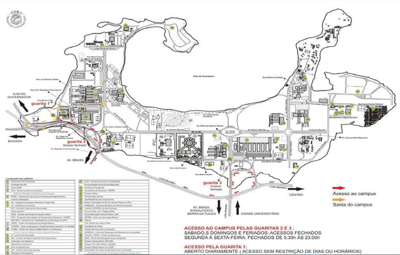 A seguir podem ser vistos mapas esquemáticos de campi universitários do Brasil: UFRJ (Campus da Ilha do Fundão); USP (Cidade Universitária, São Paulo-SP) e UFPA (Cidade Universitária, antigo Campus Universitário do Guamá, Belém-PA).