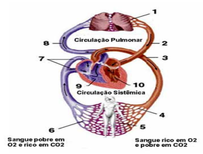 O sistema cardiovascular é constituído pelo coração, circuito pulmonar e o circuito sistêmico, como mostra a figura abaixo.