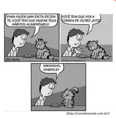 I. O humor da tirinha se constrói com base em uma interpretação inesperada de Garfield para a expressão "ver a comida de outro jeito".