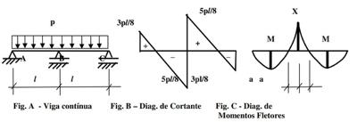 Uma viga contínua e simétrica representada abaixo na figura A está submetida a uma carga uniformemente distribuída p nos dois vãos de comprimento l. Os diagramas esquemáticos de força cortante e momento fletor estão apresentados respectivamente nas figuras B e C. Sobre essa estrutura é INCORRETO afirmar: